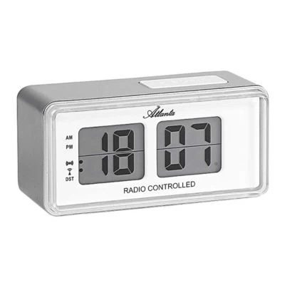 silbergraues Kunststoffgehäuse mit weißem Abstellknopf, Größe 12,5 x 6 x 6 cm, DCF77 funkgesteuertes Quarzwerk, digitale Zeitanzeige, Zeitzonen-Anpassung, einfache Einstellung über Druck-/Drehknopf, Piep-Alarm, Weckwiederholung (Snooze), spezieller Nachleuchteffekt, benötigt 2 Batterien AA (nicht im Lieferumfang enthalten)