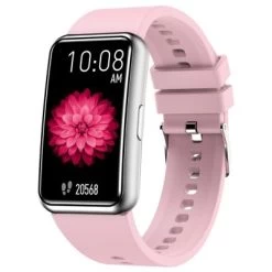 multifunktionale Smartwatch und Fitnesstracker, Quarzwerk mit Lithium Polymer Batterie, Anzeige von Uhrzeit, Datum und Wochentag, Stoppuhr, Alarmfunktion, Schrittzähler mit Distanzanzeige und Kalorienverbrauch, Anruf- und Nachrichtenalarm, Steuerung über kostenlose Smartphone App „DaFit“ möglich, Fotoauslöser, Musicplayer, Messung verschiedener Sportarten, Läuferfunktion mit Diagrammerstellung, Tiefenanalysen aller Daten, Herzfrequenzmessung, Blutdruck- und Blutsauerstoffmessung, Schlafanalyse, Wetterbericht, Helligkeitseinstellung des Displays, Smartwatch-/Smartphone-Finder, Aktivitätserinnerung, Taschenlampe, Nicht-Stören-Modus, Gehäuse aus silberfarbenem Metall und Kunststoff, Gehäusegröße 45 x 26 x 11 mm, Gewicht 28,5 g, wasserdicht nach Schutzklasse IP67, Kunststoff-Display, verschiedene Display-Anzeigen wählbar, roséfarbenes Silikonarmband, passend bis zu 22 cm Armumfang, silberfarbene Metall-Dornschließe