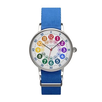 Bringen Sie Ihrem Kind mit dem Wecker MNU 1009 von Cander Berlin spielerisch innerhalb weniger Minuten das Uhrenlesen bei, unabhängig vom Alter und von den Lernfähigkeiten. Das strukturierte und zugleich farbenfrohe Lernzifferblatt ermöglicht das einfache Ablesen der Uhrzeit vom Bett und von der Ferne aus. Der Wecker ist kindgerecht, verfügt über keine scharfen Kanten, ist standsicher und hat eine handliche Größe. Er hat einen Durchmesser von 10,8 cm und eine Tiefe von 7,5 cm. Der Kinderwecker verfügt über ein geräuscharmes Sweep-Uhrwerk – es ist kein nerviges Ticken oder Summen zu hören. Nahezu lautlos schleicht der Zeiger vor sich hin und raubt Ihren Kindern weder den Schlaf noch die Nerven. Der Wecker zeichnet sich außerdem durch seine einfache Bedienbarkeit aus. Er verfügt über eine Taste auf der Oberseite, die für die Weckwiederholung (Schlummerfunktion, Snooze) und die Beleuchtung verantwortlich ist. Mit der Snooze-Funktion stoppen Sie den Alarmton für ungefähr 5 Minuten Die Zifferblattbeleuchtung erlischt automatisch nach 5 Sekunden. Auf der rechten Seite befindet sich ein Schalter, der für das An- und Abschalten der Weckfunktion zuständig ist. Der Wecker benötigt keinen Stromanschluss, da er mit einem batteriebetriebenen Quarzuhrwerk ausgestattet ist. Das Licht und das Uhrwerk werden insgesamt mit drei 1,5 Volt AA Batterien betrieben, die sich nicht im Lieferumfang des Produktes befinden.Die Armbanduhr wird von einem hochwertigen japanischen Seiko Uhrwerk angetrieben und sorgt für eine zuverlässige Zeitanzeige. Sie verfügt über ein gewebtes Stoffband und ein Metallgehäuse mit poliertem Edelstahlboden. Die Kinderuhr ist spritzwassergeschützt (1 ATM). Aufgrund des gut strukturierten Zifferblattes ermöglicht die Uhr das Ablesen der digitalen Uhrzeit mit einer analogen Uhr zu erlernen. Sie zeigt sowohl das 12-Stunden als auch das digitale 24-Stunden-Zeitformat an. Durch das farbenfrohe Design macht das Lernen noch mehr Spaß.