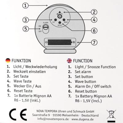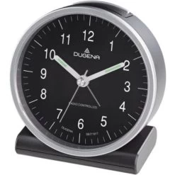 funkgesteuerter Quarzwecker mit analoger Anzeige, empfängt das DCF77, Zeitsignal für Mitteleuropa, wechselt automatisch von Sommer- auf Winterzeit, geräuscharmes Uhrwerk mit schleichendem Sekundenzeiger, Piep-Alarm mit Weckwiederholung (Snooze), ansteigendes Wecksignal, Weckfunktion mit Ruhemodus, schwarzes Zifferblatt mit deutlichen weißen Zahlen, Zifferblattbeleuchtung, fluoreszierende Zeiger, Kunststoffgehäuse schwarz/silber, Größe 103 x 115 x 55 mm, 1 Batterie 1,5 V AAA wird mitgeliefert