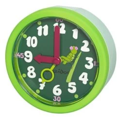 Quarz-Wecker mit kinderleichter Bedienung, Gehäuse mit einer weichen sogenannten Rubbertouch-Oberfläche, hellgrün, Piepton-Wecksignal, obenliegende Abstelltaste, dunkelgrünes Zifferblatt mit Grashüpfer-Motiv, weiße Ziffern und rote Zeiger, grüner Weckzeiger, Größe 90 x 48 mm, benötigt 1 Batterie AA (nicht im Lieferumfang enthalten)