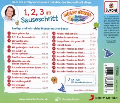 Mit modernen und heiteren Kinderliedern weiß Detlev Jöcker, wie man die Kleinen zum Strahlen bringt und sie gleichzeitig fördert. Mit 1,2,3 im Sauseschritt erhalten Sie eine tolle CD mit 16 Liedern und 7 Karaokeversionen für kleine Musikfreunde.