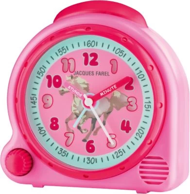 Der Kinderwecker Hapysound von JACQUES FAREL ist mit einem detailreichen Pferdemotiv geschmückt. Damit Kindern das Erlernen der Uhrzeit erleichtert wird, sind Ziffernblatt und Zeiger beschriftet.