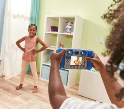 Bitte lächeln! Mit der Vtech KidiZoom Duo Pro können sich auch die Kleinsten schon als echte Profi-Fotografen versuchen. Die kindgerechte Kamera verfügt über einen einfach zu handhabenden Doppelsucher und hat sowohl links als auch rechts einen Auslöser. Mit über siebzig Effekten, Rahmen und Stempeln können geschossene Meisterwerke anschließend ganz nach Belieben bearbeitet werden. Eine Video-Funktion ermöglicht darüber hinaus die Erstellung von Filmen von bis zu zehn Minuten Länge. Der integrierte Speicher kann mittels einer separaten MicroSD-Karte in wenigen Handgriffen erweitert werden.