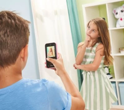 Im coolen Smartphone-Design begeistert diese Vtech KidiZoom Snap Touch. Der 2,4″ LCD-Touchscreen ist mit 5 Touch-Tasten ausgestattet und mit der Dual-Kamera können Fotos, Videos und Selfies gemacht werden. Außerdem erkennt die Kamera Gesichter und überträgt die Mimik auf animierte Figuren, was ein Riesen-Vergnügen ist. Weitere coole Funktionen, wie Bluetooth-Chat, MP3-Player, Fototagebuch, Bildbearbeitung, Kalender, Verkleiden, Zeichnen, Stimmrekorder, Notizen, Taschenrechner sorgen für viel Unterhaltung mit Lerneffekt. Integriert sind auch 6 tolle Spiele, von denen 2 zu zweit gespielt werden können. Außerdem beinhaltet die Smartphone-Kamera einen Entscheidungshelfer, Witze und Lebensweisheiten.