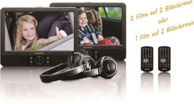 Der Lenco DVP-939 ist ein Set mit zwei kompakten DVD-Playern mit jeweils einem 9 Zoll Bildschirm. Mit den beiden separaten Bildschirmen kann man zu zweit den gleichen Film oder jeder etwas anderes schauen.