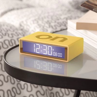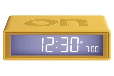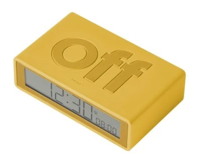 LCD-Quarzwecker in skandinavischem Design, auch als Reisewecker bestens geeignet, das funkgesteuerte Quarzwerk empfängt europaweit das Zeitsignal DC77 aus Mainflingen, Deutschland, digitale Anzeige von Uhrzeit und Weckzeit, 12- oder 24h-Format wählbar, die Weckfunktion ist aktiviert, wenn der Schriftzug ON oben liegt, Alarmsignal mit Piepton, der sich alle 10 Sekunden beschleunigt und nach 30 Sekunden kontinuierlich tönt, Alarm-Ausschaltung durch Drehung des Gehäuses auf die OFF-Seite, Schlummerfunktion mit Weckwiederholung nach 5 Minuten (Snooze), Hintergrundbeleuchtung (4 Sekunden lang) per Touch Sensor, Gehäuse aus ABS-Kunststoff und gelbem Kautschuk, Design: Adrian & Jeremy Wright, Größe 104 x 65,5 x 30 mm, 2 Batterien AAA werden mitgeliefert