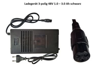 Ladegerät 3-Polig 48V, DC 1.0 – 3.0 A schwarz Ausgangsspannung: 48V Ausgangsstrom: DC: 1.0-3.0A Nennfrequenz: 50 / 60Hz Nennspannung: 100-240 V AC Stecker: Rundstecker 3Pin, Außendurchmesser ca. 13 mm, LED-Anzeige für Ladestatus Verwendung ausschließlich für Blei Akku