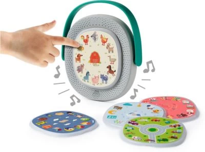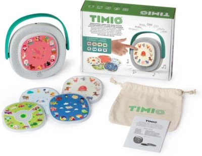 Der interaktive und lehrreiche Audio-Player von Timio, der mit Kindern vom Kleinkindalter bis zur Grundschule mitwächst: Der Timio Player begeistert Kinder ab zwei Jahren mit einfacher Bedienung, magnetischen Discs, farbenfroher Gestaltung sowie Licht- und Soundeffekten. Timio Audioplayer Starter Set Themen Audio-Dics: Gute-Nacht-Geschichten, Klassische Musik, Fahrzeug- und Bauernhoftierlaute Sprachen: Deutsch, Englisch, Spanisch, Französisch, Niederländisch, Chinesisch (Mandarin), Italienisch, Portugiesisch mit Licht- und Soundeffekten, Quiz-Modus, Tragegriff, Kopfhöreranschluss, Abschaltfunktion (10 Minuten Inaktivität), Lautstärkeregler (3 Stufen) Lieferumfang: Audioplayer, 5 magnetische Audio-Discs, Disc-Aufbewahrungstasche, Bedienungsanleitung ab 2 Jahren geeignet Lernen leicht gemacht: Kids ab zwei Jahren können einfach eine der magnetischen Discs auswählen, sie auf den Timio legen und auf eins der abgedruckten Bilder tippen. Schon kann das Lernen losgehen. Die fünf im Lieferumfang enthaltenen Discs enthalten Gute-Nacht-Geschichten, Klassische Musik sowie spanndende Fahrzeug- und Bauernhoftierlaute. Da es beim Timio keine Bewegt-Bilder gibt, konzentrieren sich die Kleinen auf die Stimme und die Geräusche. Das LED-Licht und die kindgerechten Abbildungen verbessern dabei das visuelle Erlebnis und ermöglichen eine intutive und einfache Bedienung. Im ein- und ausschaltbaren Quiz-Modus stellt der Timio den Kindern verschiedene Fragen und verstärkt durch diese Interaktivität den Lernprozess. Praktisch: Nach zehn Minuten Inaktivität schaltet sich der Timio automatisch aus. Die Lautstärke des Timio kann je nach Bedarf in drei Stufen eingestellt werden. Der Timio Audioplayer verwendet magnetische Discs, um eine große Bibliothek mit ausgewählten und altersgerechten Inhalten freizuschalten, die mit dem Kind mitwächst und von Kinderliedern über Geschichten bis hin zu Vokabeln spielerisches Wissen vermittelt. Für noch mehr Lernspaß können die Discs in acht unterschiedlichen Sprachen abgespielt werden. Hinweis Für den Betrieb sind Batterien (3xAA) nötig. Diese sind nicht im Lieferumfang enthalten – bitte separat bestellen. Erweiterungs-Sets mit spannenden, neuen Inhalten sind separat erhältlich.
