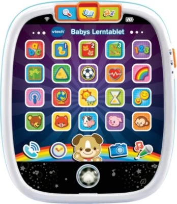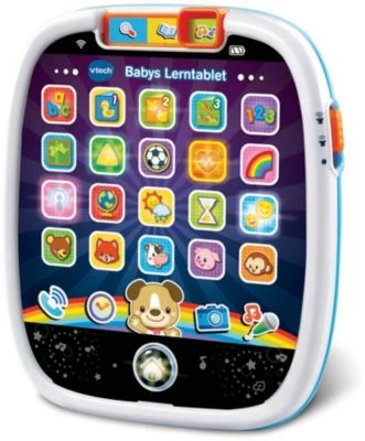 Bunter Entdeckerspaß mit Babys Lerntablet! Babys eigenes Lerntablet mit vielen bunten Tasten, Melodien und Liedern zum Mitsingen. Verschiedene Lerninhalte: Alphabet, Formen, Zahlen, Tiere und Geräusche.